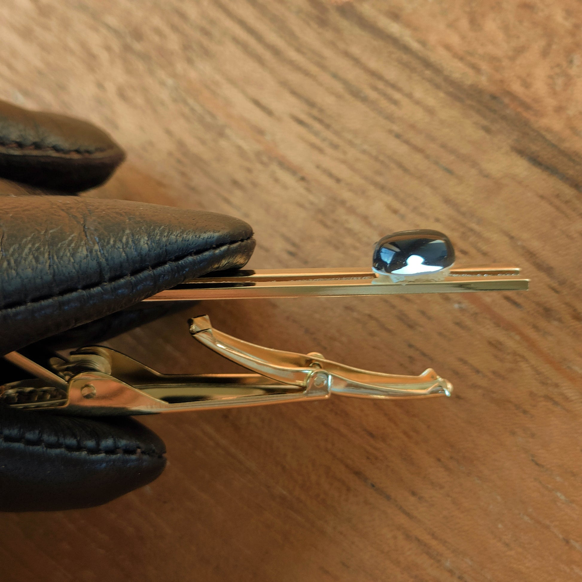 男性用のネクタイ留めです。ネクタイの大剣と小剣、シャツの3枚を一緒に留め、しっかりと固定してください。右から左へ挿し、ピンが水平になるように留めるのが一般的です。カジュアルな場所では少し斜めに着けて遊び心を演出してもOK。