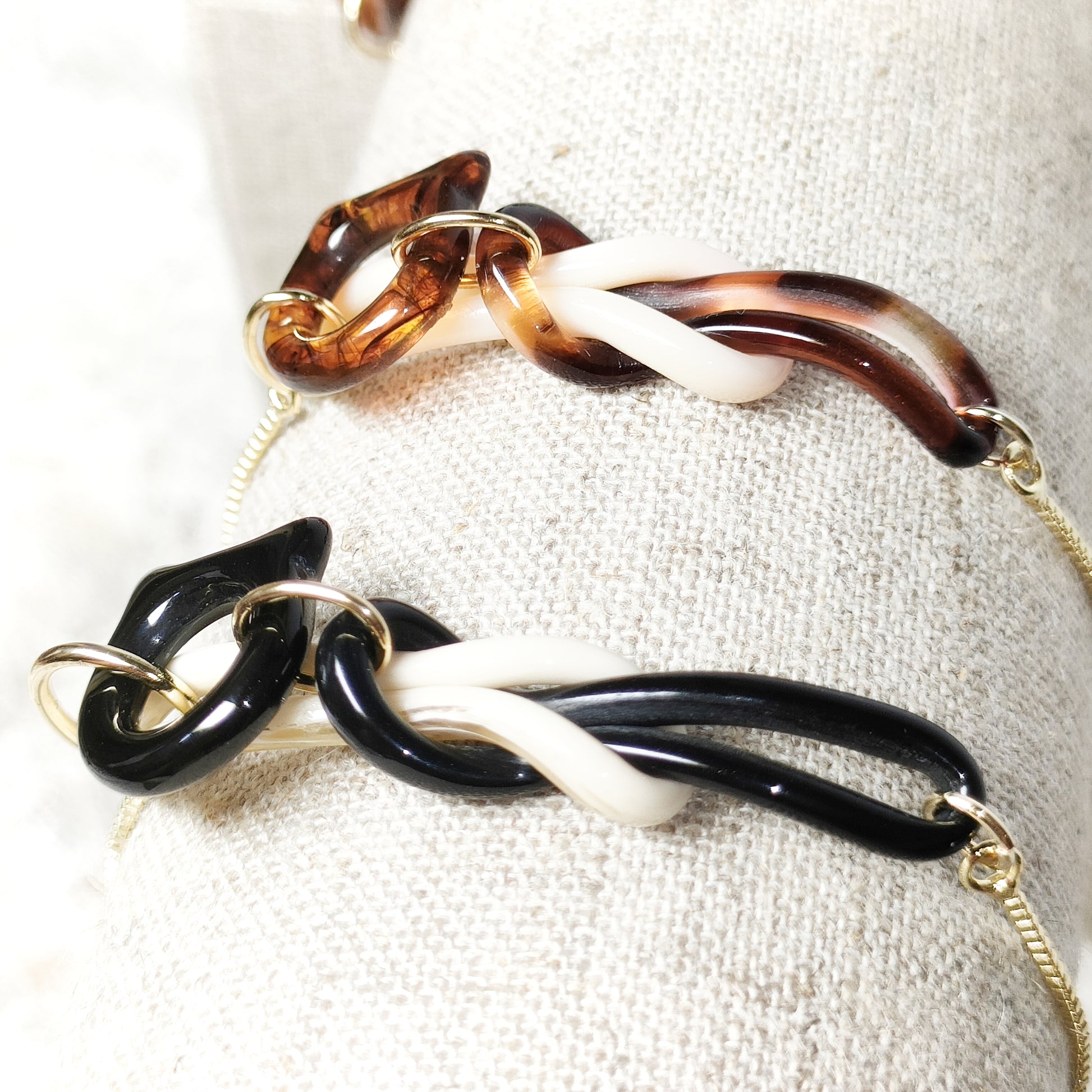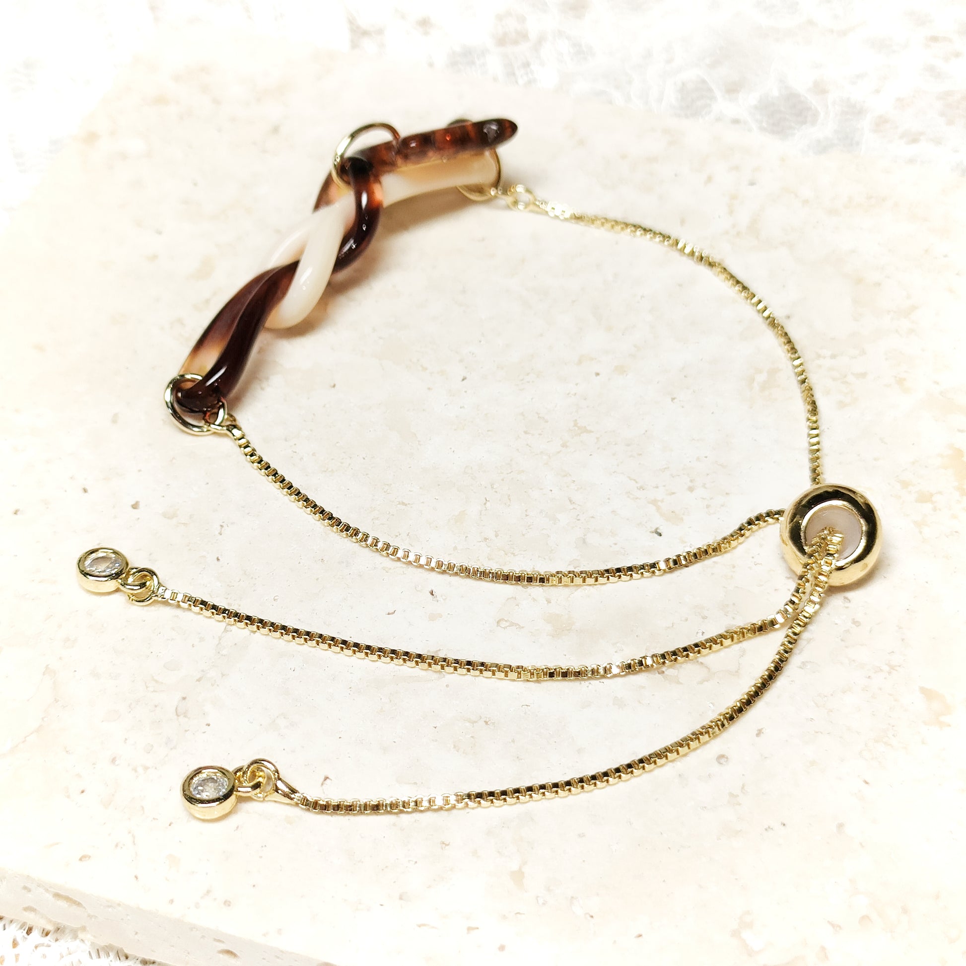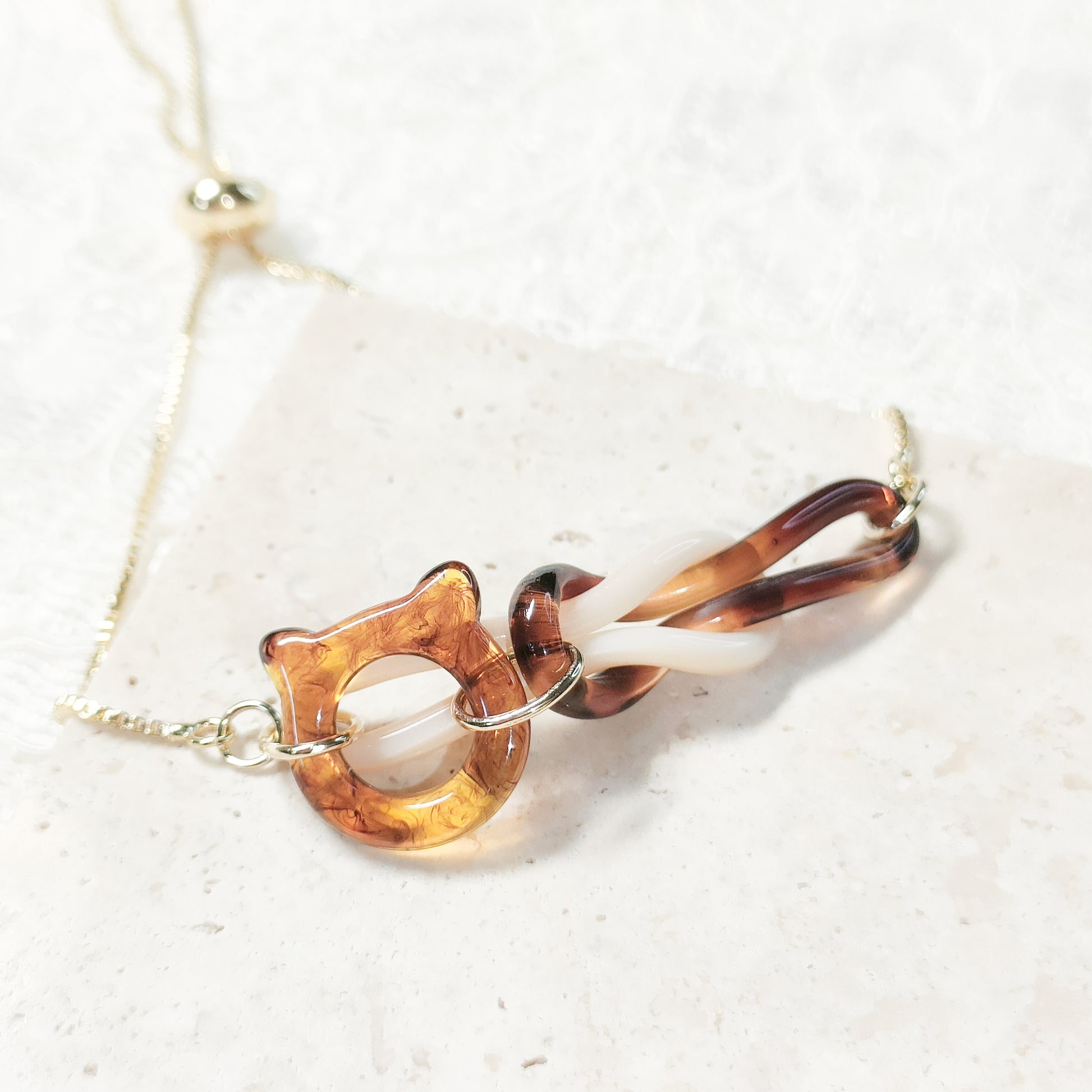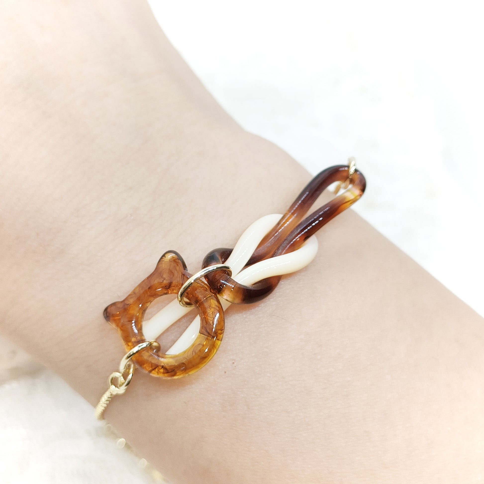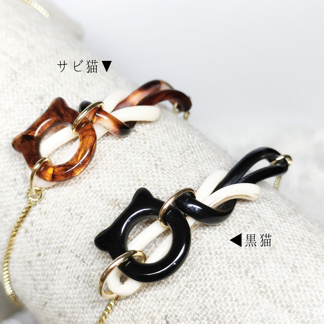 そのパーツを腕に馴染むよう僅かに曲げ、ブラウンとブラックをそれぞれサビ猫・黒猫と重ね合わせました。ブレスレットには長く愛用できる18KGPを採用。片手で装着しやすいシリコンアジャスター付き。