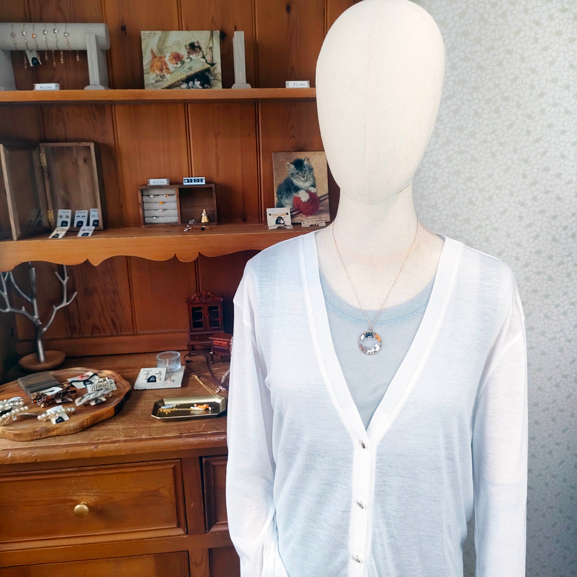 大きめのモチーフなので、襟より下にモチーフが来るよう、少し長めのネックレスを採用しています。