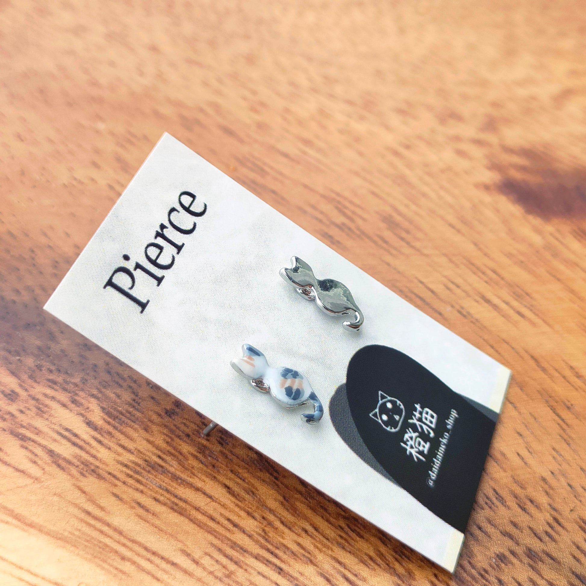 繊細な絵柄が描かれた猫が一匹、シルバーのシンプルな猫が一匹のアシンメトリーデザイン。