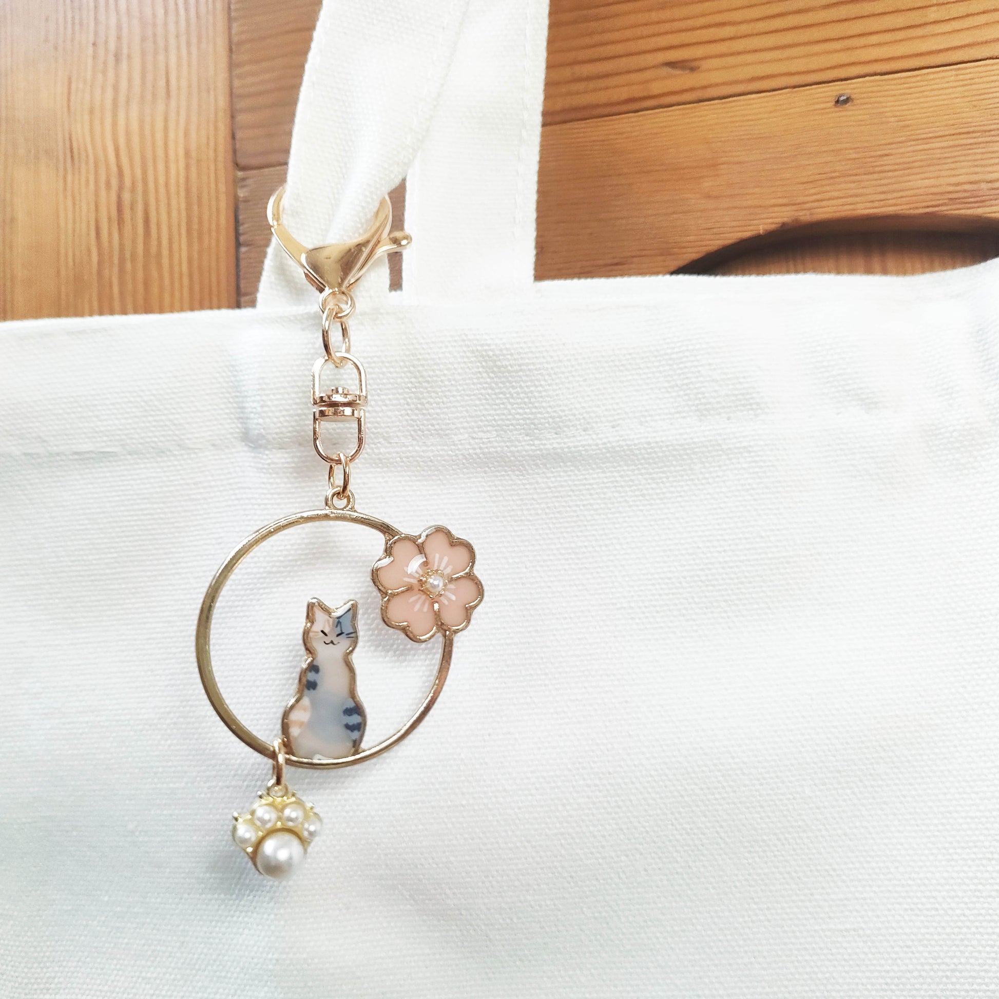 フックパーツは内径15mmと少し大きめなので、バッグチャームとしてもお使いいただけます。柔らかい素材のものであれば、トートバッグにもギリギリ着けられるサイズです(写真参照)。